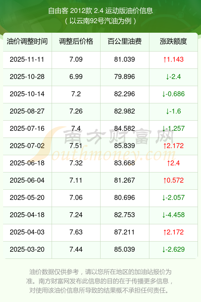 按照11月11日92號(hào)汽油最新調(diào)整價(jià)格7.09元/升來(lái)計(jì)算(以云南為例),該車型百公里平均油費(fèi)為81.039元,按照上一輪10月28日調(diào)整價(jià)格6.99元/升來(lái)計(jì)算,百公里平均油費(fèi)為79.896元,對(duì)比上一輪多花1.143元,下一輪油價(jià)調(diào)整時(shí)間為11月24日24時(shí)。