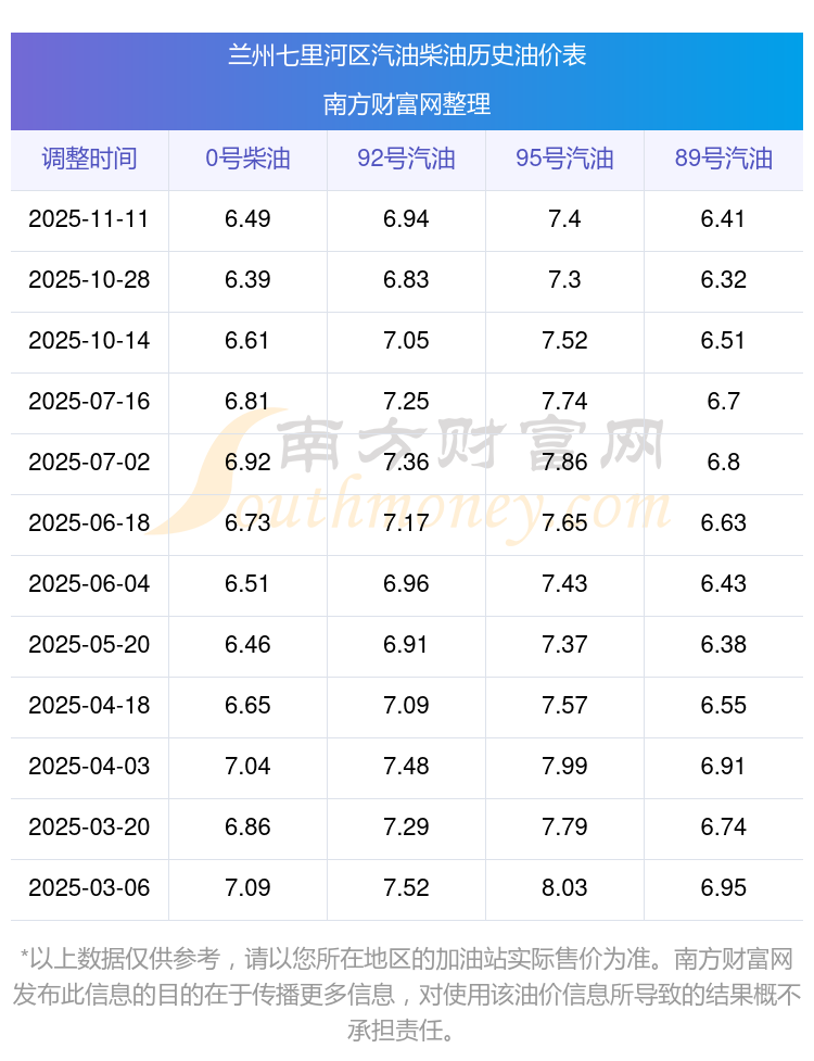 蘭州七里河區(qū)歷史油價表