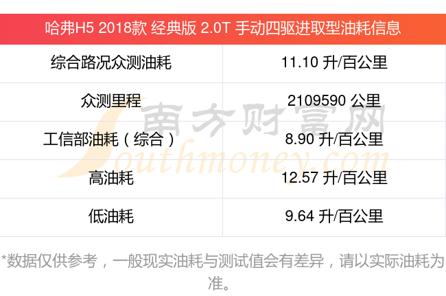 根據車主實測數(shù)據,該車型低油耗為9.64L/100km,高油耗為12.57L/100km,綜合路況眾測油耗為11.10L/100km,工信部綜合油耗為8.90L/100km。