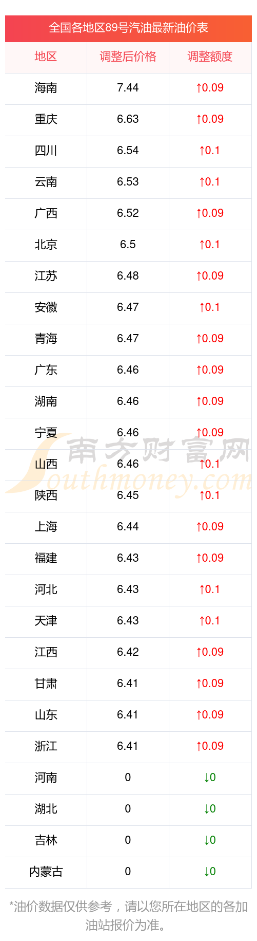 11月16日全國(guó)89號(hào)汽油最新平均價(jià)格為7元每升(根據(jù)11月11日調(diào)整后的價(jià)格),其中89號(hào)汽油最高為海南,價(jià)格為7.44元/升,全國(guó)89號(hào)汽油最低為浙江,價(jià)格為6.41元/升。