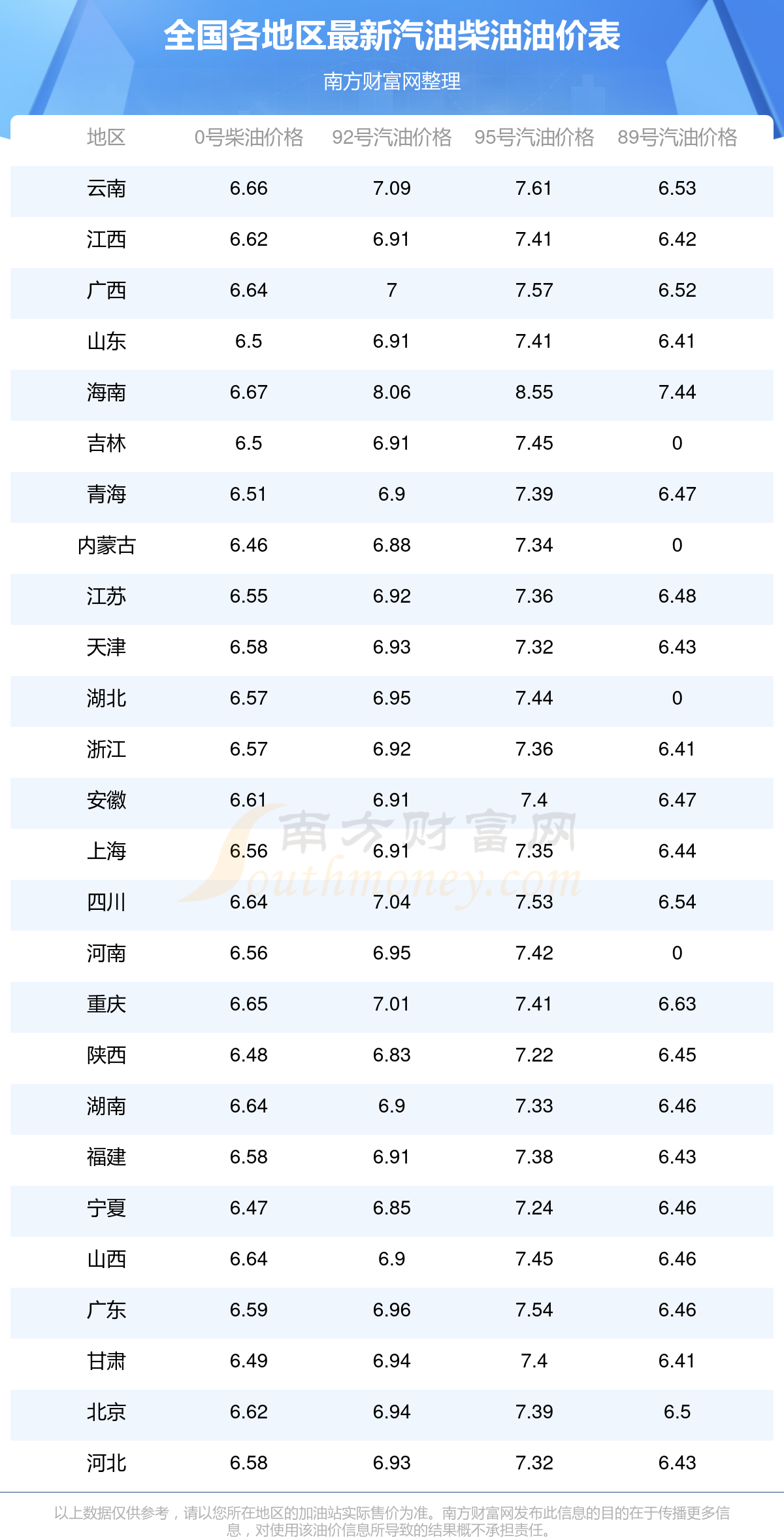 以上數(shù)據(jù)僅供參考,請以您所在地區(qū)的加油站實際售價為準。南方財富網(wǎng)發(fā)布此信息的目的在于傳播更多信息,對使用該油價信息所導致的結(jié)果概不承擔責任。