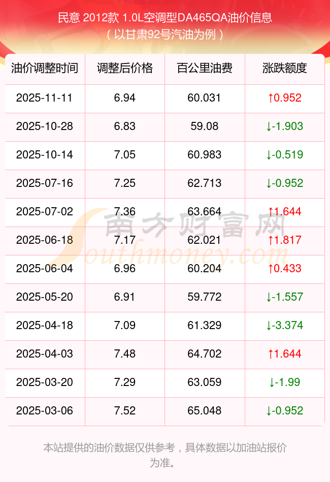 根據(jù)11月11日92號汽油最新調(diào)整價格6.94元/升來計算(以甘肅為例),該車型每百公里的平均油費是60.031元,上一輪10月28日調(diào)整價格6.83元每升來計算,每百公里的平均油費是59.08元,對比上一輪多花0.952元,下一輪的油價調(diào)整時間是11月24日24時。