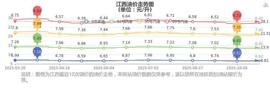11月16日江西汽油、柴油的價(jià)格多少錢一升?本輪油價(jià)調(diào)整時(shí)間是11月11日,92號(hào)汽油6.91元,上漲了0.1元,上漲幅達(dá)1.47%;95號(hào)汽油7.41元,上漲了0.1元,上漲幅達(dá)1.37%;89號(hào)汽油6.42元,上漲了0.09元,上漲幅達(dá)1.42%;0號(hào)柴油6.62元,上漲了0.1元,上漲幅達(dá)1.53%。
