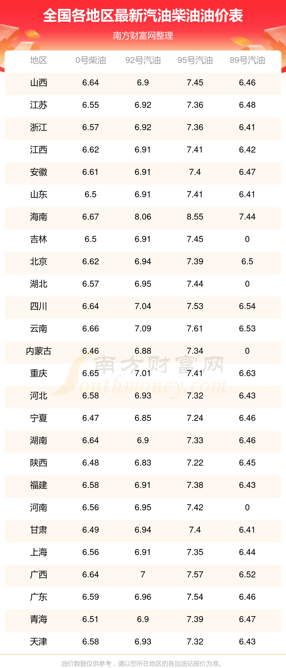 油價(jià)數(shù)據(jù)僅供參考,請以您所在地區(qū)的加油站報(bào)價(jià)為準(zhǔn)。南方財(cái)富網(wǎng)發(fā)布此信息的目的在于傳播更多信息,對使用該油價(jià)信息所導(dǎo)致的結(jié)果概不承擔(dān)任何責(zé)任。