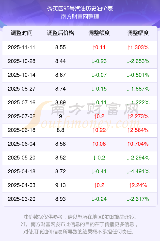 11月16日秀英區(qū)95號汽油歷史油價調(diào)整一覽表
