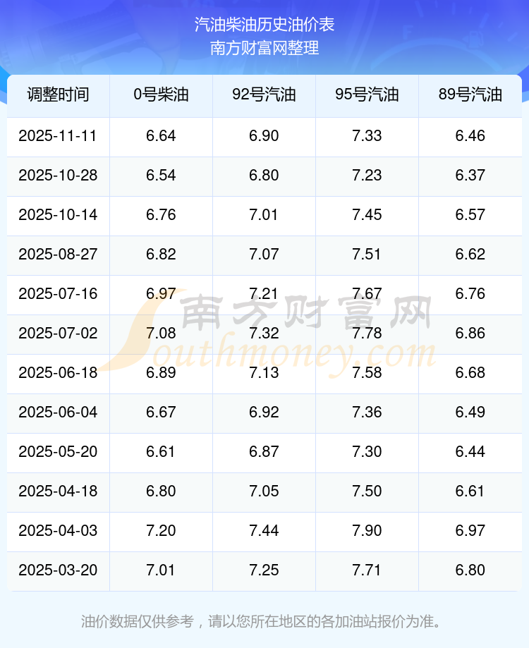 11月16日,常德95號(hào)汽油的價(jià)格為7.33元/升,這是11月11日油價(jià)調(diào)整后的價(jià)格,對(duì)比上一輪油價(jià)調(diào)整時(shí)間10月28日的價(jià)格7.23元每升,上升了0.11元,上升幅達(dá)1.462%。下一輪油價(jià)調(diào)整時(shí)間11月24日24時(shí),距離現(xiàn)在還有8.12天。