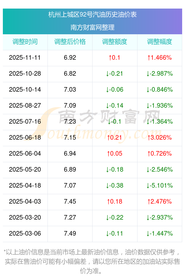 11月16日杭州上城區(qū)92號汽油的最新價格(11月11日調(diào)整后的價格):6.92元/升,相對上次調(diào)整升了0.1元。