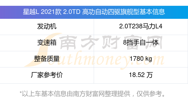 星越L 2021款 2.0TD 高功自動(dòng)四驅(qū)旗艦型動(dòng)力方面,搭載的是一臺(tái)2.0T238馬力L4渦輪增壓發(fā)動(dòng)機(jī),匹配8擋手自一體自動(dòng)檔變速箱,燃料形式為汽油,常規(guī)整備質(zhì)量1780kg,廠家參考價(jià)18.52萬(wàn)元。