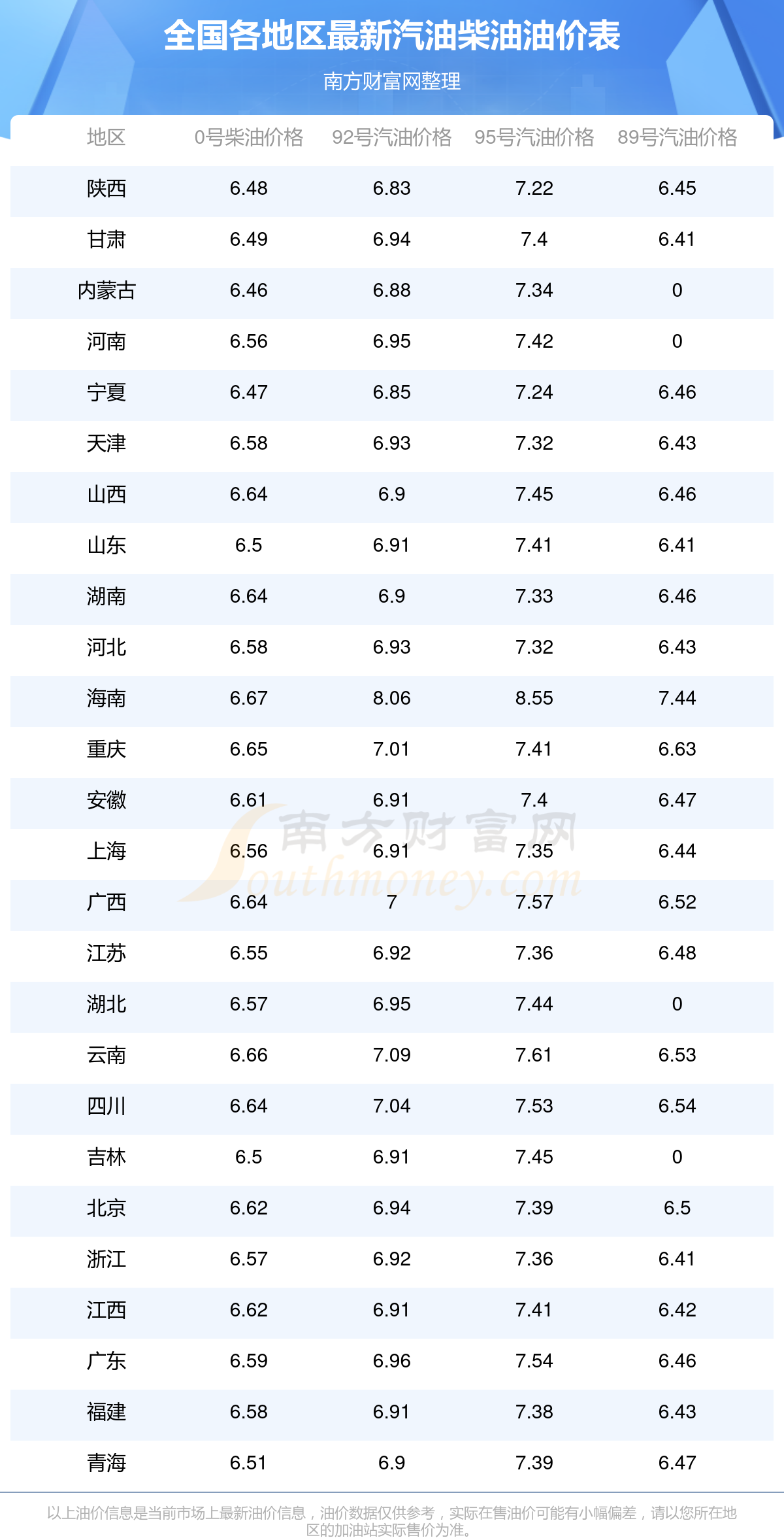 本次油價(jià)的調(diào)整時(shí)間為11月11日,調(diào)整后全國(guó)92號(hào)汽油平均價(jià)格為7元每升,其中,最低的是陜西,6.83元每升,最高的是海南,8.06元每升。全國(guó)95號(hào)汽油平均價(jià)格為7元每升,其中,最低的是陜西,7.22元每升,最高的是海南,8.55元每升。全國(guó)0號(hào)柴油平均價(jià)格為:7元每升,其中,最低的是內(nèi)蒙古,6.46元每升,最高的是海南,6.67元每升。全國(guó)89號(hào)汽油平均價(jià)格為7元每升,其中,最低的是浙江,6.41元每升,最高的是海南,7.44元每升。,下一輪油價(jià)調(diào)整時(shí)間11月24日24時(shí),距離現(xiàn)在還有8.11天。