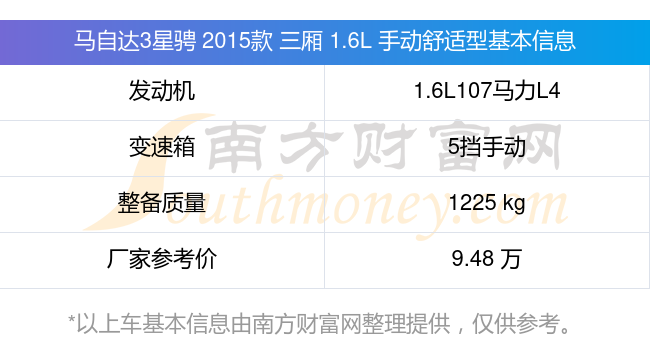 在動力上,馬自達3星騁 2015款 三廂 1.6L 手動舒適型配備的是一臺1.6L107馬力L4自然吸氣發(fā)動機,匹配的是5擋手動擋變速箱,燃料形式為汽油,常規(guī)整備質(zhì)量1225kg,廠家參考價9.48萬元。