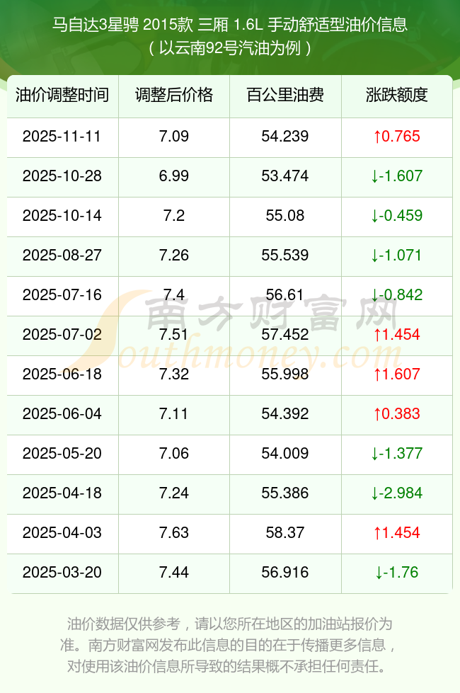 依照11月11日92號汽油最新調(diào)整價格7.09元/升來計算(以云南為例),該車型百公里的平均油費是54.239元,依照上一輪10月28日調(diào)整價格6.99元/升來計算,百公里的平均油費是53.474元,對比上一輪多花0.765元,下一輪的油價調(diào)整時間11月24日24時。