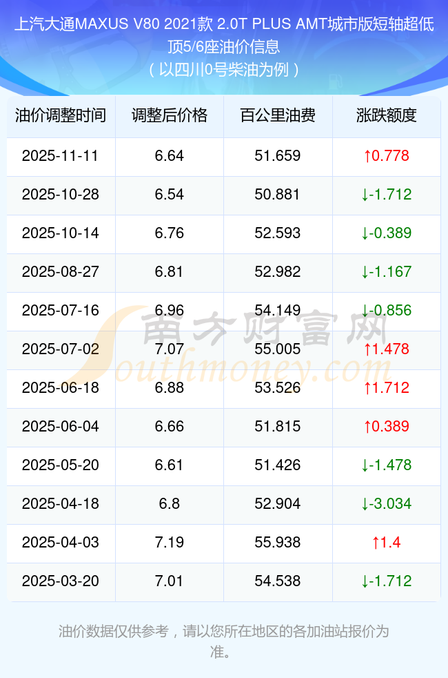 根據(jù)11月11日0號柴油最新調(diào)整價格6.64元/升來計算(以四川為例),該車型每百公里的平均油費是51.659元,上一輪10月28日調(diào)整價格6.54元每升來計算,每百公里的平均油費是50.881元,對比上一輪多花0.778元,下一輪的油價調(diào)整時間是11月24日24時。