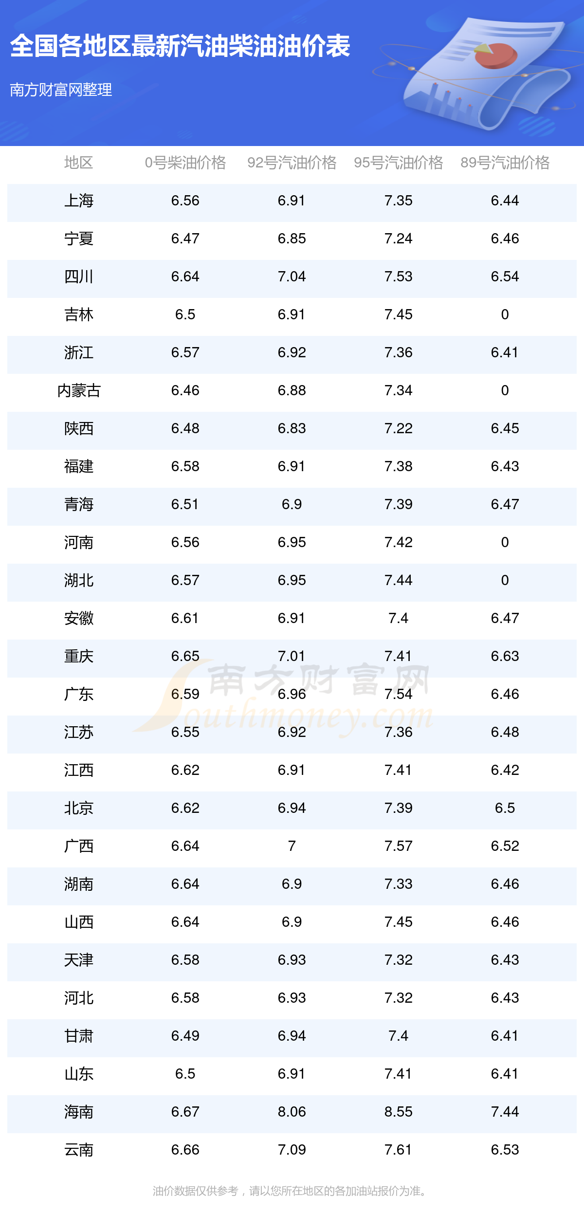 全國各地區(qū)最新油價表