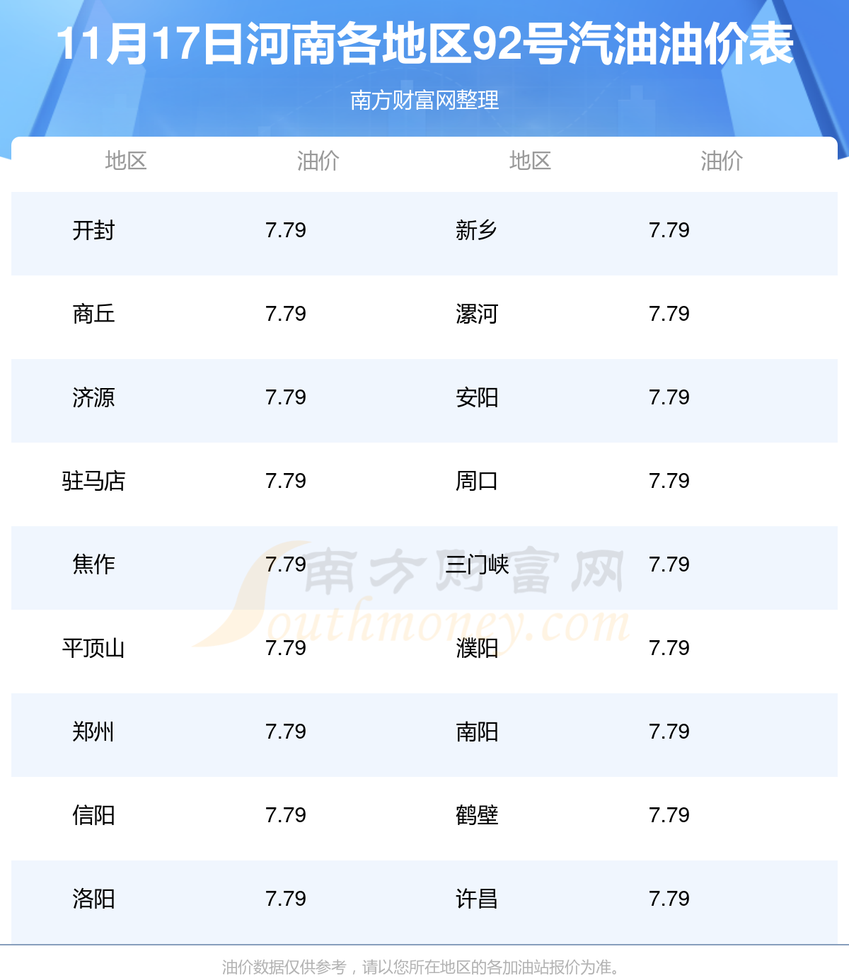 11月17日,河南92號汽油的最新價(jià)格為6.95元/升,是11月11日調(diào)整后的價(jià)格,對比上次油價(jià)調(diào)整上漲了0.1元,上漲1.46%。