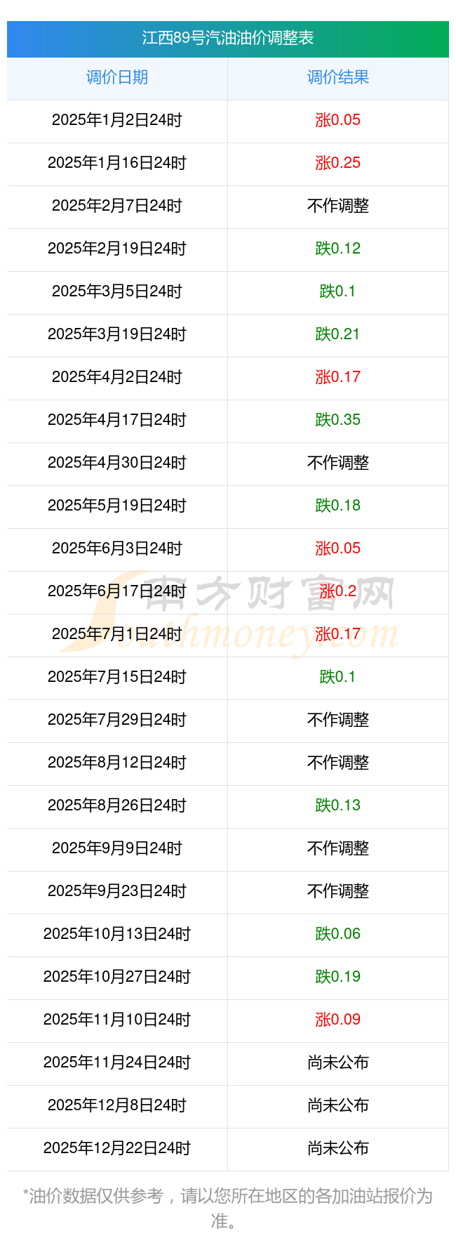11月17日,江西89號汽油的價格是6.42元每升,本次的調(diào)整時間為11月11日,對比上次的調(diào)整上升了0.09元,上升1.422%,11月24日24時為下一輪油價調(diào)整時間,還有7.86天。