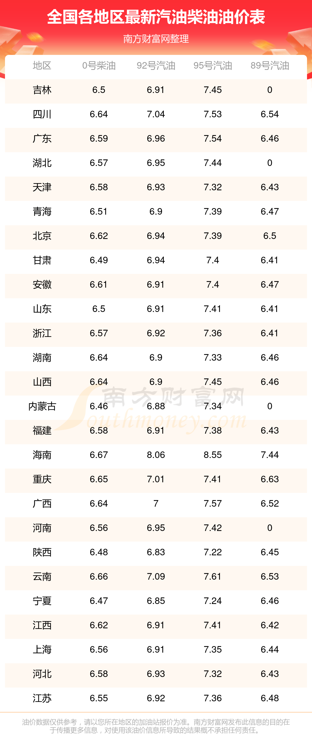 全國0號柴油平均價(jià)格為:7元每升,其中,最低為內(nèi)蒙古,價(jià)格6.46元/升,最高為海南,價(jià)格6.67元/升。