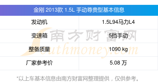 金剛 2013款 1.5L 手動(dòng)尊貴型動(dòng)力上配備的是一臺(tái)1.5L94馬力L4自然吸氣發(fā)動(dòng)機(jī),匹配的是5擋手動(dòng)擋變速箱,燃料形式為汽油,常規(guī)整備質(zhì)量1090kg,廠家參考價(jià)5.08萬(wàn)元。