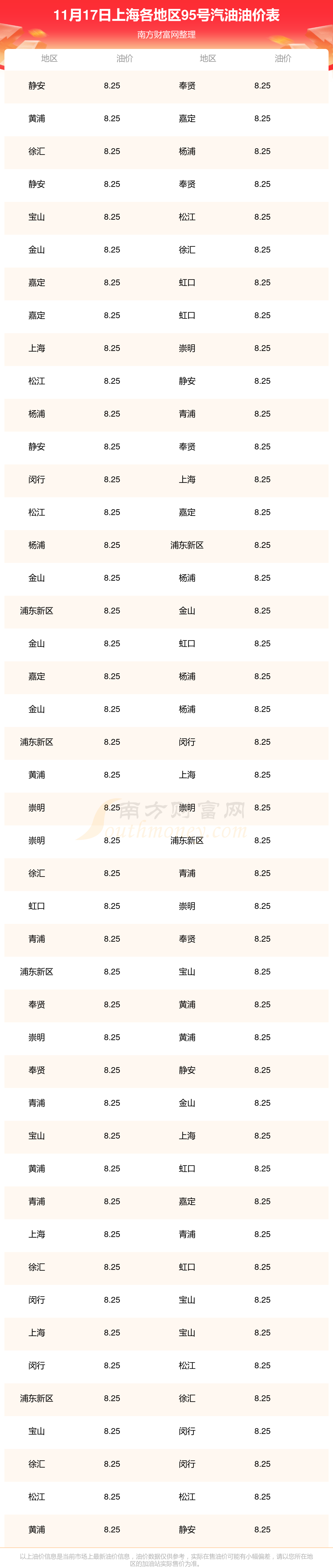 上海95號汽油11月17日價格為7.35元/升,調(diào)整時間為11月11日,相對上次調(diào)整時間10月28日的油價7.24元/升,上升了0.11元。