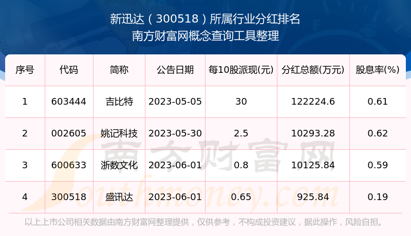 按照南方財(cái)富網(wǎng)趨勢(shì)選股系統(tǒng)統(tǒng)計(jì),新迅達(dá)所屬行業(yè)為游戲行業(yè),游戲行業(yè)分紅排名情況如下表: