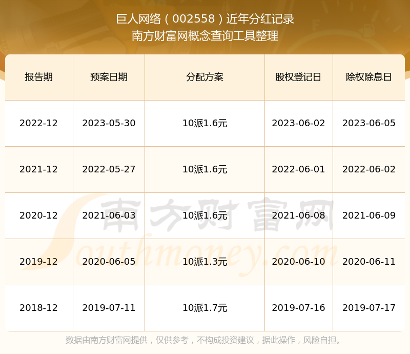 巨人網(wǎng)絡(luò)最新一次公布的分紅方案:10派1.6元。