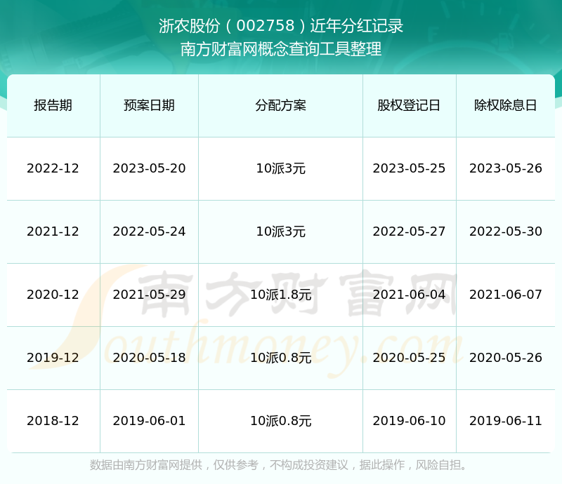 浙農(nóng)股份最新一次公布的分紅方案為10派3元。本次權(quán)益分派股權(quán)登記日為2023年5月25日,除權(quán)除息日為2023年5月26日,派息日為2023年5月26日。