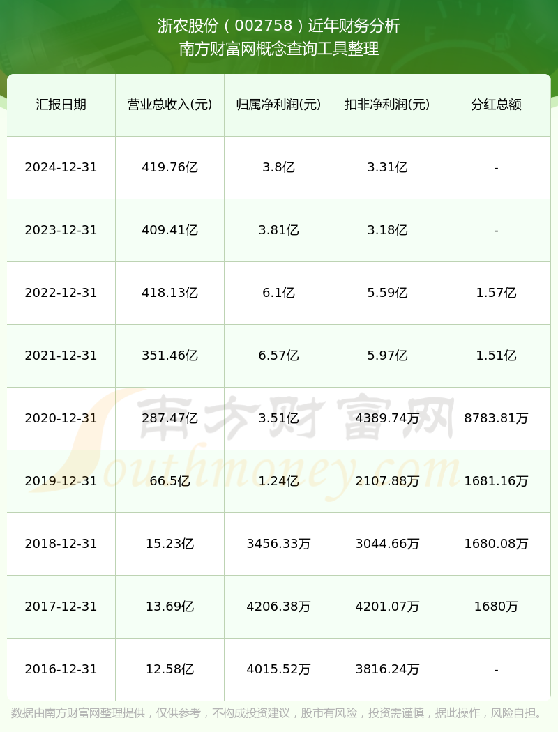 浙農(nóng)股份公司2024年實現(xiàn)營收419.76億元,凈利潤3.8億元,毛利率5.79%。